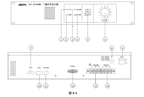 以 GST-GF500WA 型廣播功率放大器為例進行說明,其外形及結構示意圖如圖 9-3。