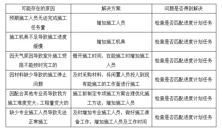 在施工之前應制定月、周施工進度計劃表,規定其施工節點日期,管理人員應對照進度計劃表檢查相對應的節點檢及施工進度是否與計劃表相對應,如不符合計劃進度表有偏離的應找出問題所在,匹配原進度計劃表完成計劃任務。