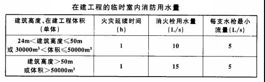 9、在建工程的臨時室內(nèi)消防用水量不應(yīng)小于下表的規(guī)定。