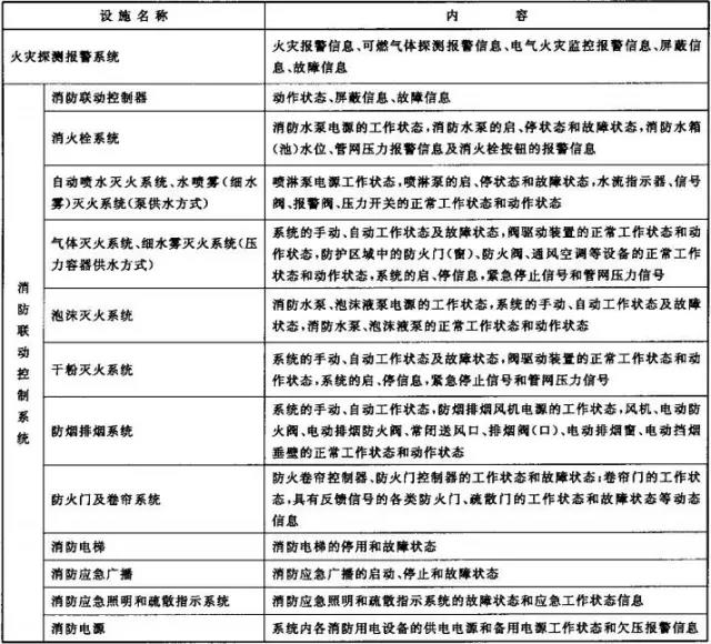 2、消防控制室內(nèi)設(shè)置的消防設(shè)備應(yīng)能監(jiān)控并顯示建筑消防設(shè)施運(yùn)行狀態(tài)信息,并應(yīng)具有向城市消防遠(yuǎn)程監(jiān)控中心(以下簡(jiǎn)稱監(jiān)控中心)傳輸這些信息的功能。建筑消防設(shè)施運(yùn)行狀態(tài)信息見下表1。