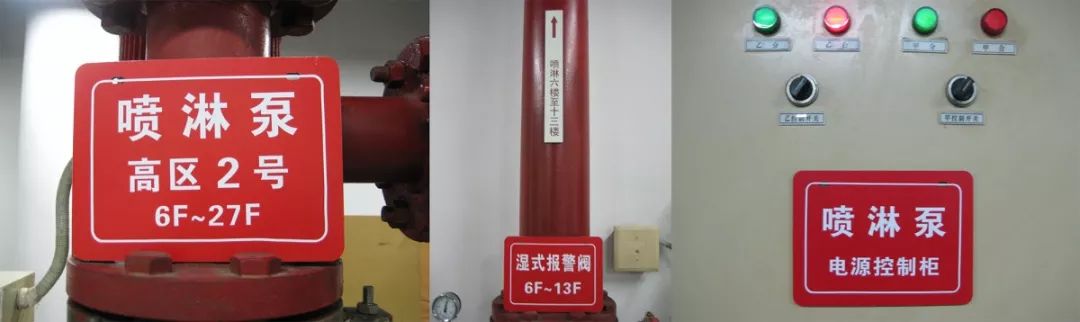設(shè)置要求:水泵、報警閥、控制柜等標(biāo)牌應(yīng)為紅底白字,標(biāo)明編號、所管樓層范圍、水流方向等相關(guān)內(nèi)容。