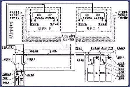 該系統(tǒng)由滅火劑瓶組、加壓氣體瓶組、驅(qū)動氣體瓶組(可選)、單向閥、選擇閥、減壓裝置、驅(qū)動裝置、集流管、連接管、噴頭、信號反饋裝置、安全泄放裝置、控制盤、檢漏裝置、管道管件及吊鉤支架等組成。