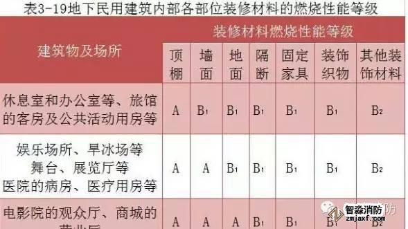 2.地下民用建筑內(nèi)部各部位裝修材料的燃燒性能等級,不應低于表3-19的規(guī)定。