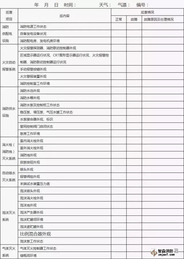 4、附表中各項目情況正常打“√”,存在問題或故障的打“×”;對發(fā)現(xiàn)的問題應(yīng)及時處理,當場不能處置的要填報《建筑消防設(shè)施故障處理記錄》。