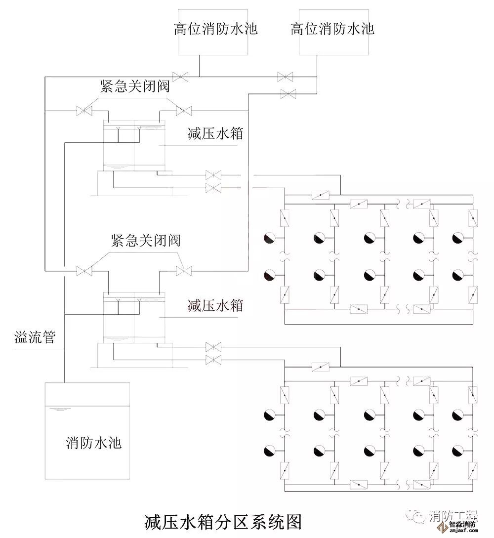 4)減壓水箱應有兩條進、出水管,且每條進、出水管應滿足消防給水系統所需消防用水量的要求。