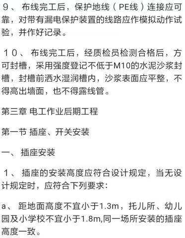 9、 電工作業后期完工后,應對插座、開關、燈具等進行檢查試用,應符合《電氣安置、安裝工程電氣設備交接試驗標準》是有關規定,并作好記錄。