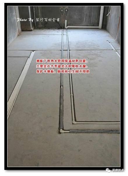 客廳下的熱水管用保溫棉包住,因為沒有包住的話容易使地板受熱變形開裂等而廚房和衛生間的不用,因為是用水泥封起了