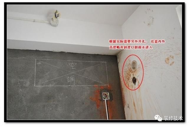 室內壁掛空調安裝示意圖,根據實際機位另打出墻孔,注意內高外低略有斜度,以防雨水進入