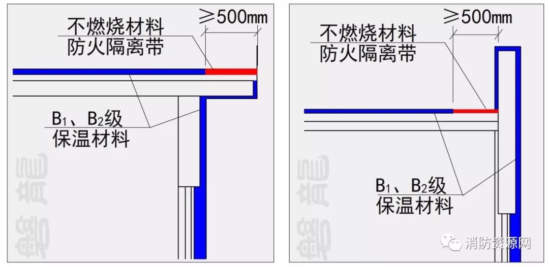三、建筑的屋面和外墻外保溫系統(tǒng)均采用B1、B2級保溫材料時,屋面與外墻之間應采用寬度不小于500mm的不燃材料設置防火隔離帶進行分隔。