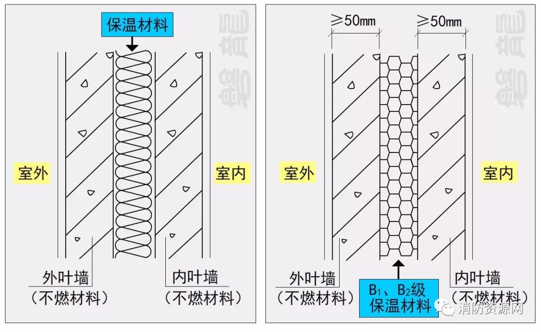 當保溫材料的燃燒性能為B1、B2級時,保溫材料兩側(cè)的不燃材料墻體厚度均不應小于50mm。