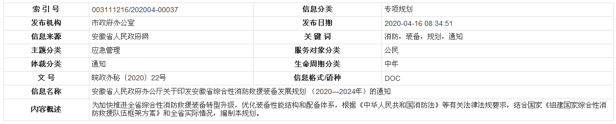 安徽省人民政府辦公廳關于印發安徽省綜合性消防救援裝備發展規劃(2020—2024年)的通知