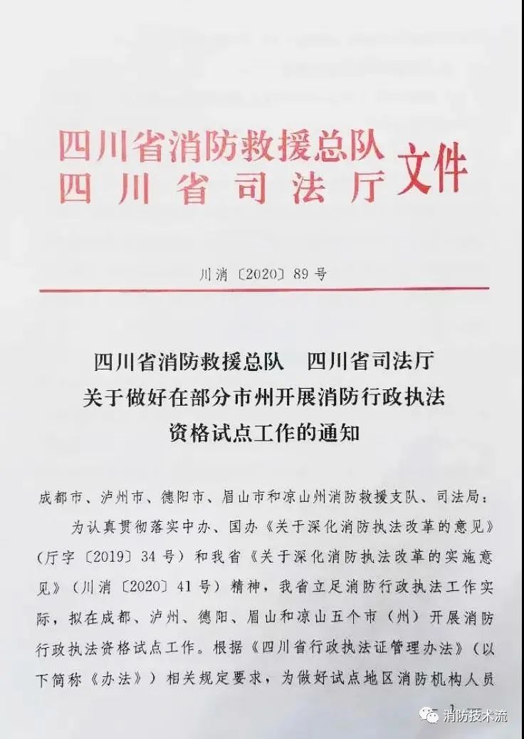 主要立足四川實際,明確在成都、瀘州、德陽、眉山和涼山五個市(州)開展消防行政執法資格試點工作,在試點地區,消防員可以參加地方行政執法人員執法資格考試,考試合格后便可取得四川省行政執法資格,對切實提升該省火災防控水平應和急救援實戰能力,進一步推進消防執法改革進程具有重大現實意義。