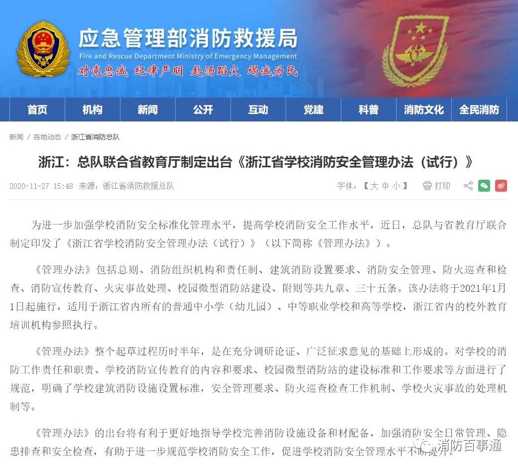 為進一步加強學校消防安全管理,提高學校消防安全工作水平,結合浙江教育實際,我廳會同省應急管理廳、省消防救援總隊聯合制定出臺《浙江省學校消防安全管理辦法(試行)》(以下簡稱《管理辦法》)。