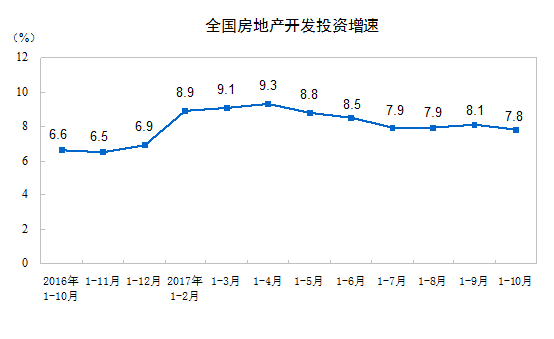 2017年1-10月份,全國房地產開發(fā)投資90544億元,同比名義增長7.8%,增速比1-9月份回落0.3個百分點。其中,住宅投資61871億元,增長9.9%,增速回落0.5個百分點。住宅投資占房地產開發(fā)投資的比重為68.3%。