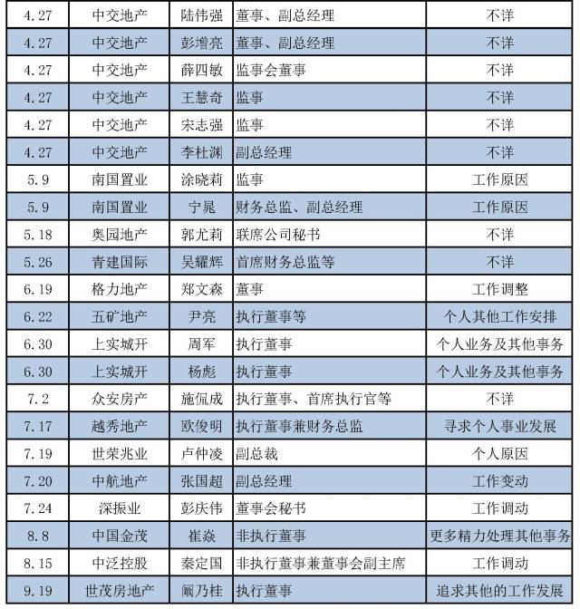 今年以來大部分房企高管的離職,都是自己提出辭呈,而公司公布的理由也是各有各的說法,曾一度引發(fā)外界各種猜測(cè)。在各種離職原因中,出現(xiàn)頻率最高的是“個(gè)人原因”以及“工作變動(dòng)(或調(diào)動(dòng))”。