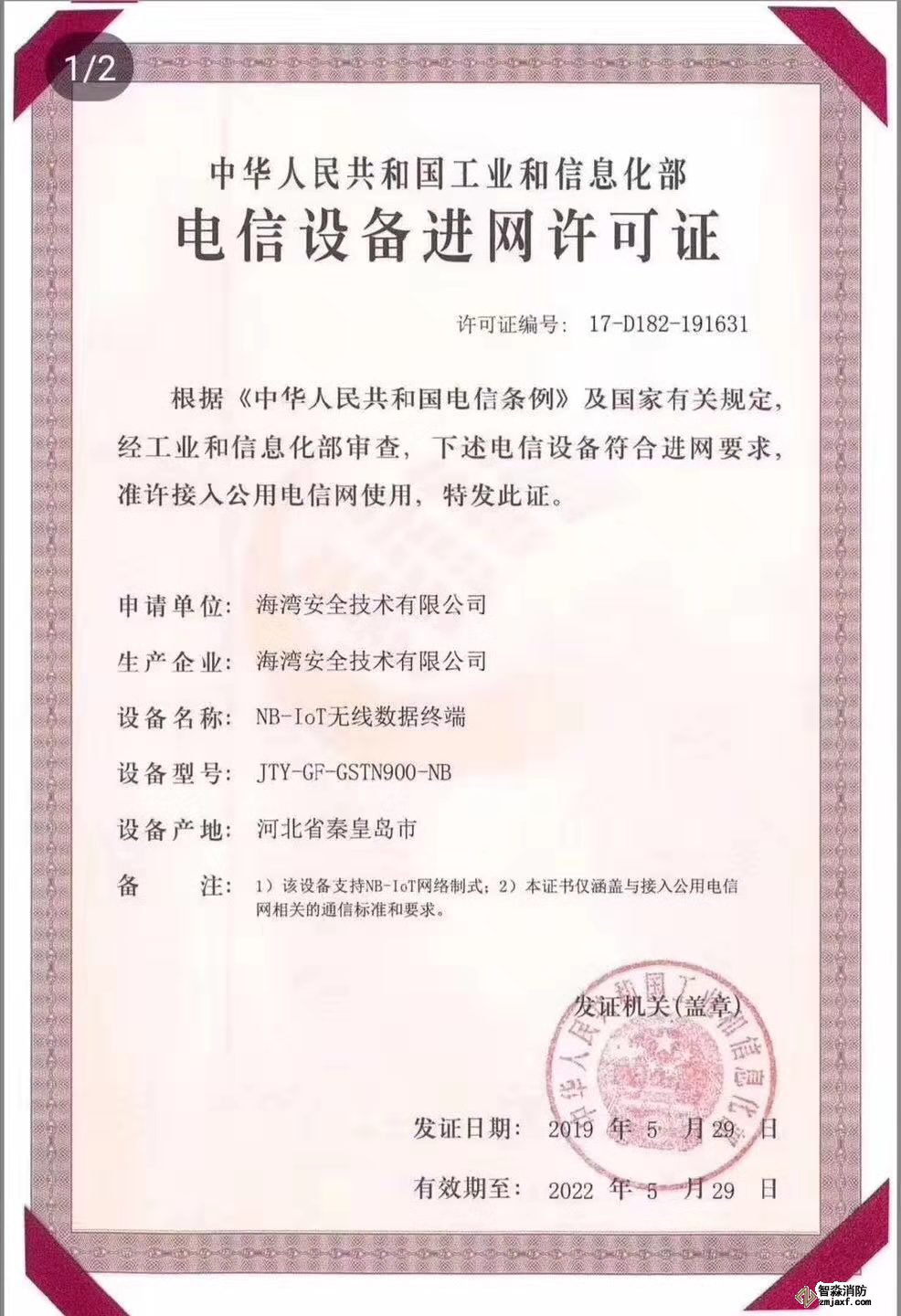 海灣NB煙感是國內唯一可提供工信部入網許可證的廠家