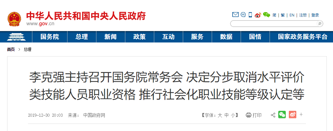 國務院總理李克強12月30日主持召開國務院常務會議,決定分步取消水平評價類技能人員職業資格,推行社會化職業技能等級認定。