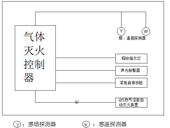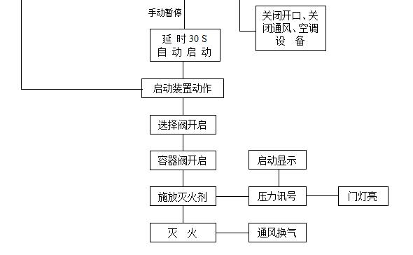 發(fā)生火災(zāi)時(shí),當(dāng)一路探測(cè)器報(bào)警后,設(shè)在該防護(hù)區(qū)域內(nèi)的警鈴動(dòng)作;兩路探測(cè)器都報(bào)警后,設(shè)在該防護(hù)區(qū)域內(nèi)外的蜂鳴器及閃燈動(dòng)作;系統(tǒng)進(jìn)入延時(shí)階段,控制盤完成相關(guān)設(shè)備的聯(lián)動(dòng)控制。經(jīng)過(guò)延時(shí)后,控制盤輸出24V直流信號(hào)電源啟動(dòng)儲(chǔ)氣瓶組上的電磁閥,打開儲(chǔ)氣瓶組釋放滅火劑氣體,滅火劑沿噴射短管和噴頭輸送到防護(hù)區(qū)域滅火。如值班人員先于火災(zāi)探測(cè)系統(tǒng)發(fā)現(xiàn)火情,當(dāng)用手提式滅火器或其它移動(dòng)式滅火設(shè)備無(wú)法撲滅火災(zāi)時(shí),可直接手動(dòng)啟動(dòng)來(lái)滅火。如發(fā)現(xiàn)是系統(tǒng)誤動(dòng)作,或確有火災(zāi)發(fā)生但僅使用手提式滅火器和其它移動(dòng)式滅火設(shè)備即可撲滅火災(zāi),可按下設(shè)在防護(hù)區(qū)域門外的緊急止噴按鈕,可以使系統(tǒng)暫時(shí)停止釋放藥劑。如需繼續(xù)開啟氣體滅火系統(tǒng),則只需松開緊急停止開關(guān)即可。