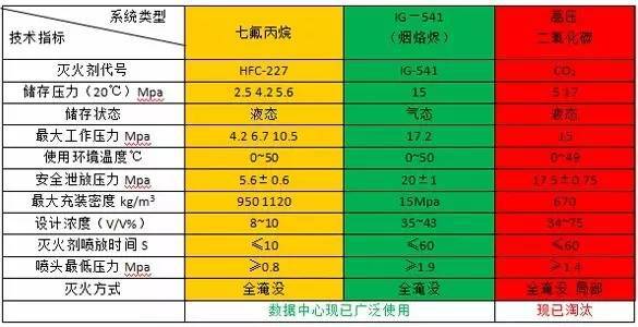 下文將針對數據中心機房中氣體滅火系統的選擇,講述七氟丙烷與IG541煙洛盡系統的對比。二氧化碳滅火系統會使人窒息,且在滅火過程中產生的殘留物對設備造成污染,現已很少出現,本文只做簡單介紹。