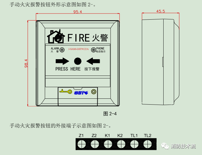K1、K2:額定 DC30V/100mA 無(wú)源輸出端子,當(dāng)報(bào)警按鈕按下時(shí),輸出觸點(diǎn)閉合信號(hào),可直接控制外部設(shè)備。