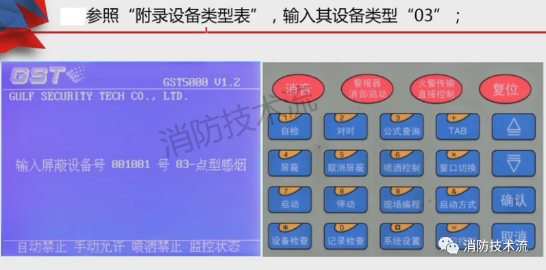輸入需要屏蔽的設備編號六位數字以及設備類型編碼,如001001號點型探測器代碼為03