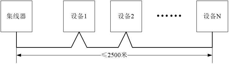 布線方式建議采用手拉手方式,可采用T形布線,N≤109。其中集線器與設(shè)備N(xiāo)需要配置匹配電阻,其他設(shè)備不配置匹配電阻。